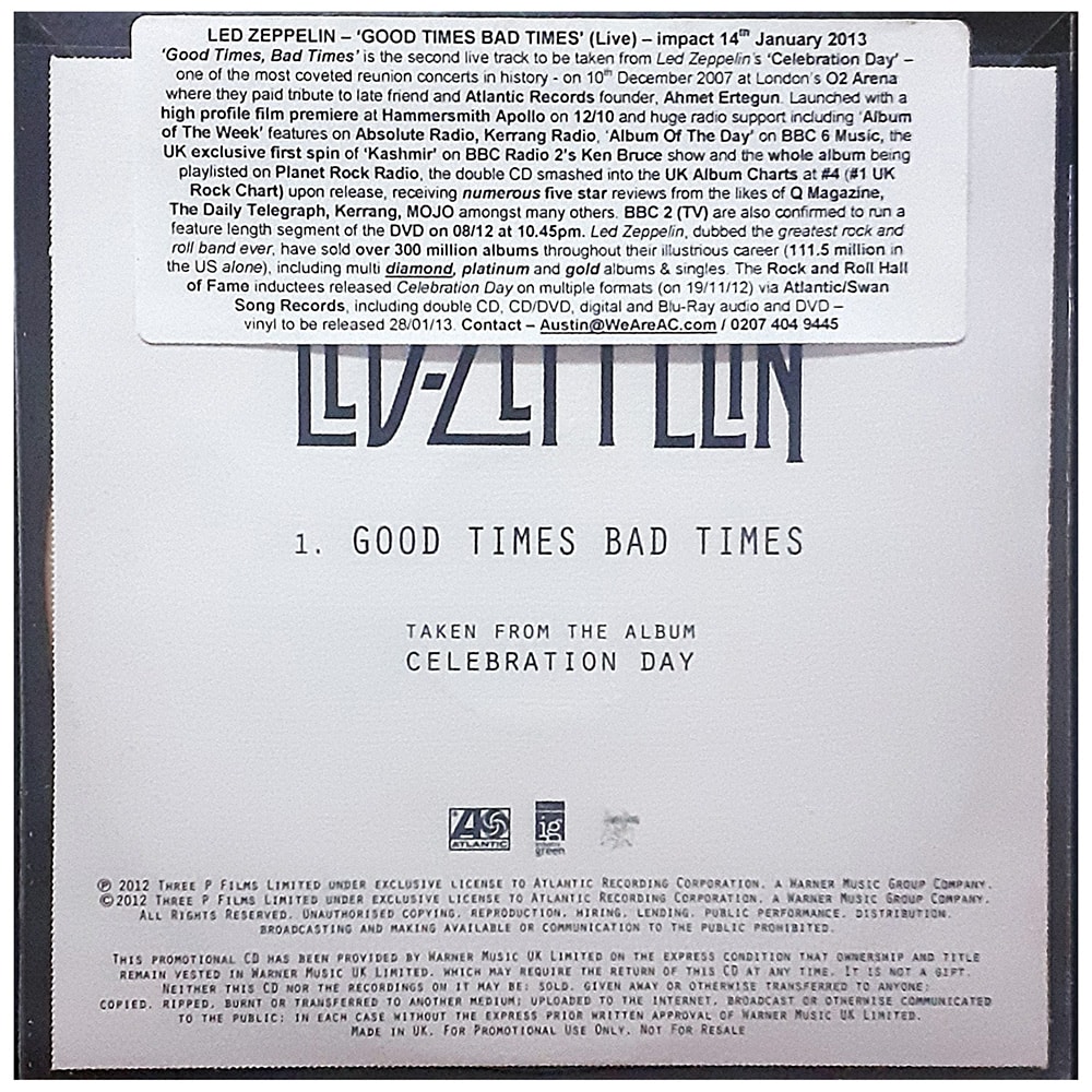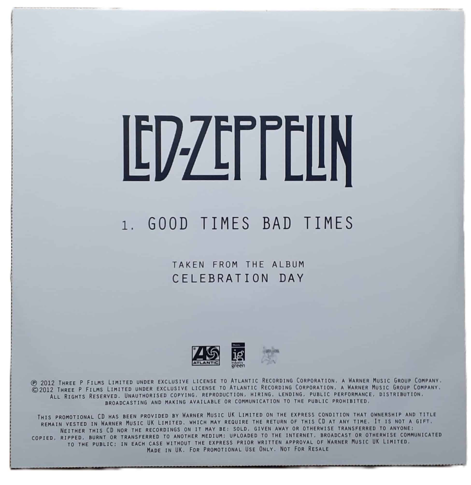 This UK-issued, advanced promotional CD features a single track, “Good Times Bad Times,” and was used to promote the release of Celebration Day.