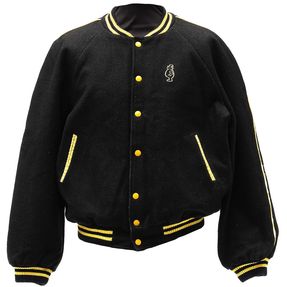 Version #1 – Black buttons, varsity style jacket yellow stripes on the collar and waist, Harvey Goldsmith logo on the front.