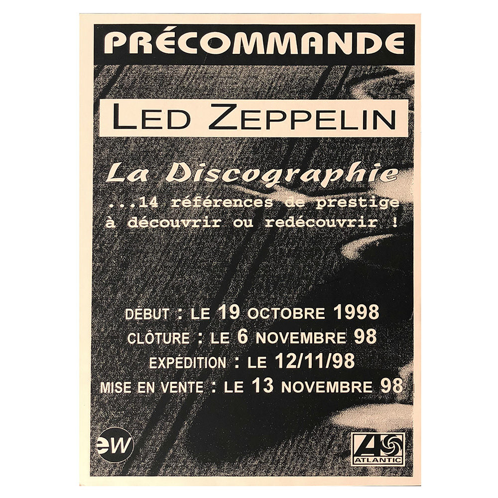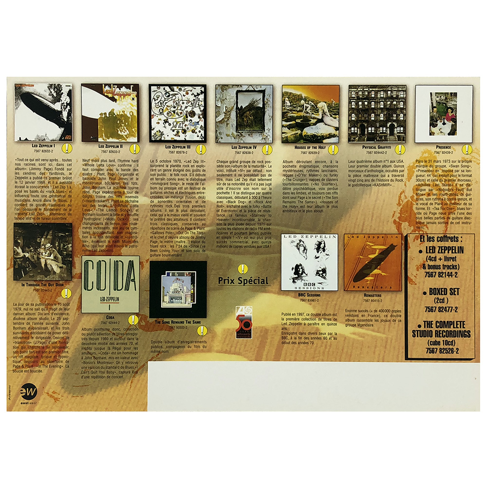 A 2-sided, thick glossy stock marketing campaign flyer distributed by East-West and given to record store merchants in France to promote the Led Zeppelin catalog during the Page/Plant 1988 France tour.