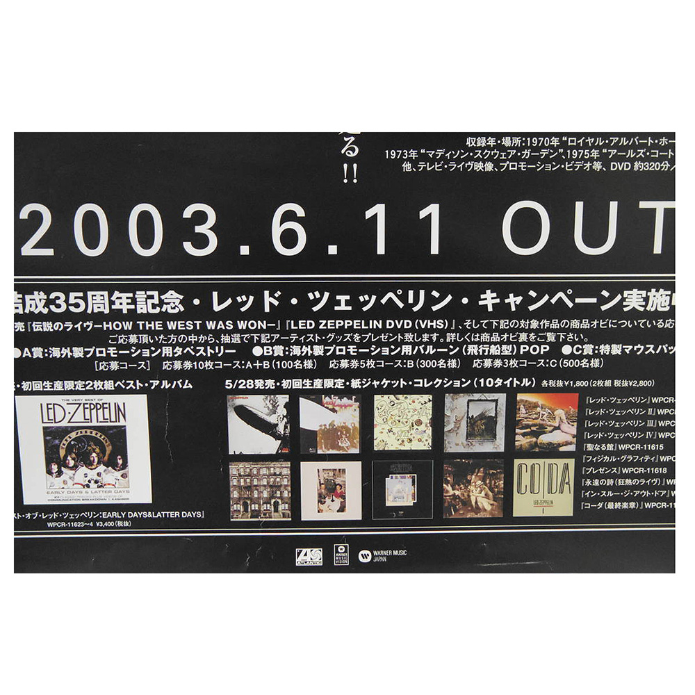 This promotional poster from Japan was used to advertise the June 11, 2003 release of How The West Was Won & Led Zeppelin DVD and measure approximately 20″ x 28″.