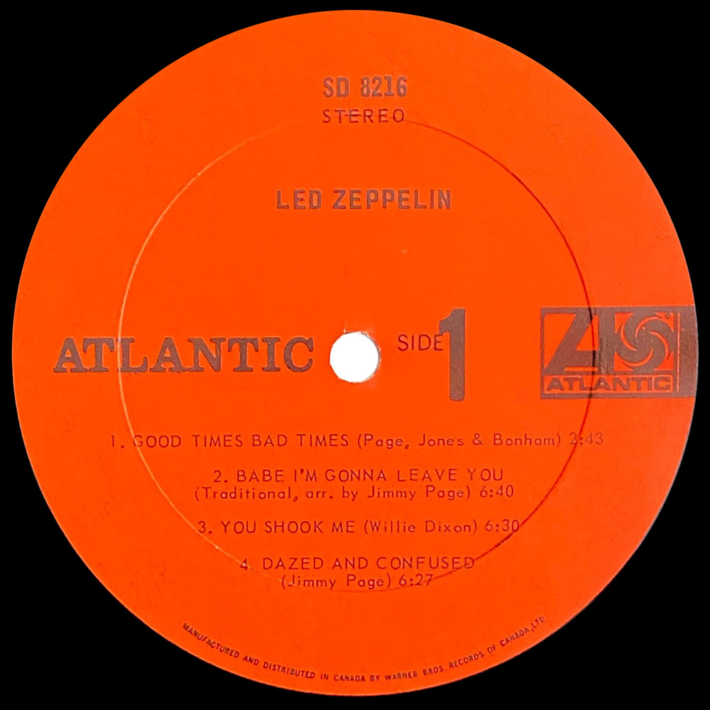 Version #11 – Green/orange labels, WEA Music distribution, “I” under “LED ZEPPELIN” in the upper half of label, “GOODTIMES BAD TIMES” misprint, Warner logo, and “Warner Communications” text in the lower half of label