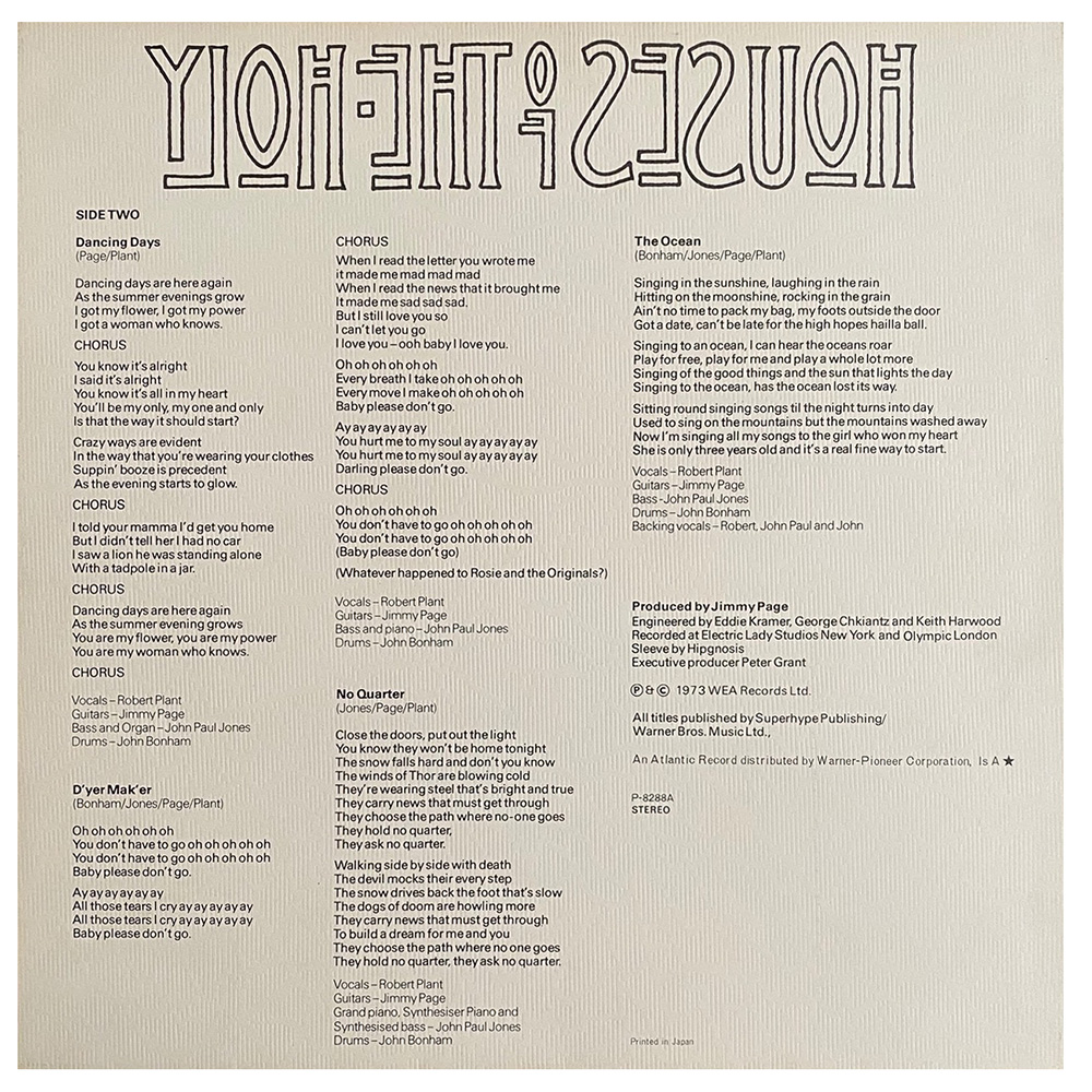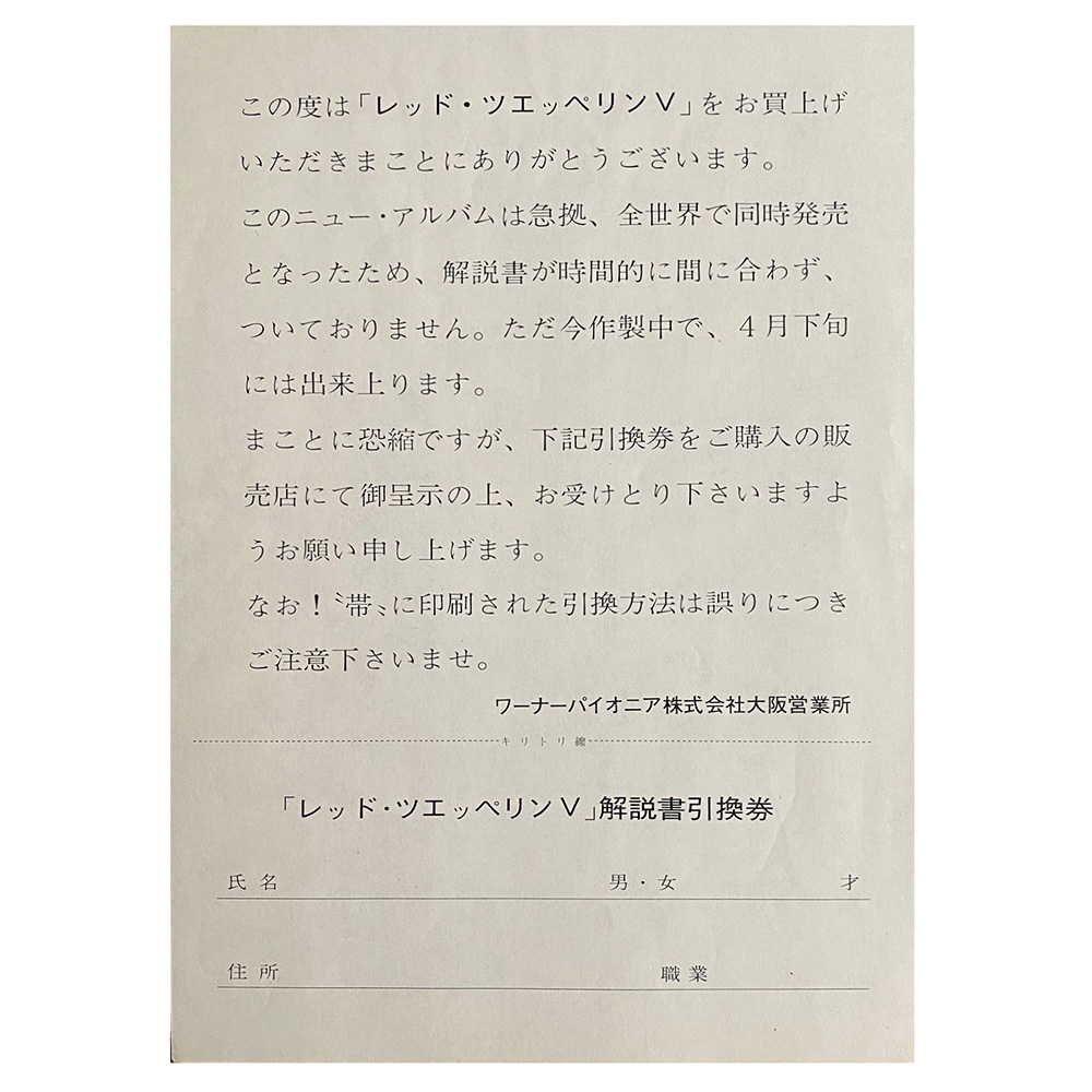 This is the first pressing. What is unusual about this record is that it comes with an insert which translates as “Application form for insert” for the “Led Zeppelin V” LP (you can see the two Roman numeral Vs in the top and bottom lines of text). It appears that the LP was issued before the inserts were ready and that a buyer could send off for the insert when they were available. I’ve never seen another copy of this one.