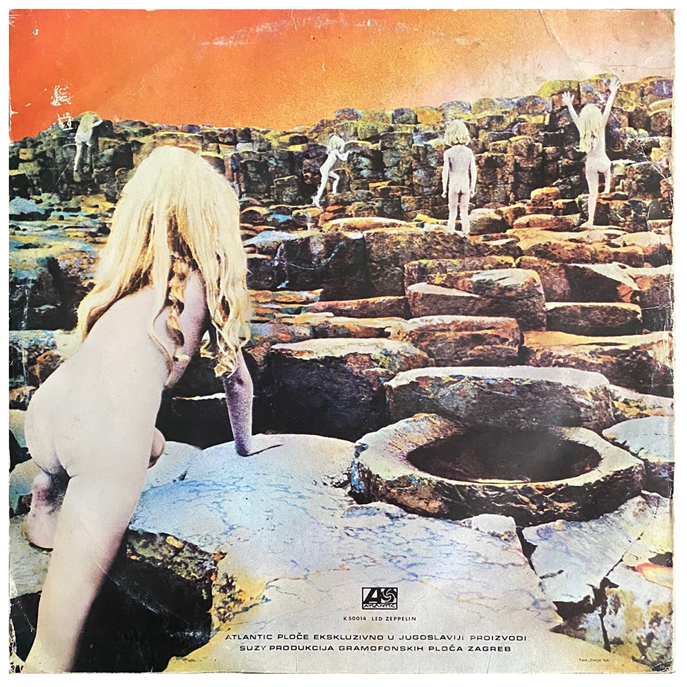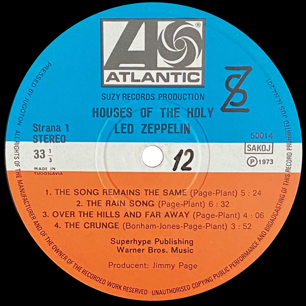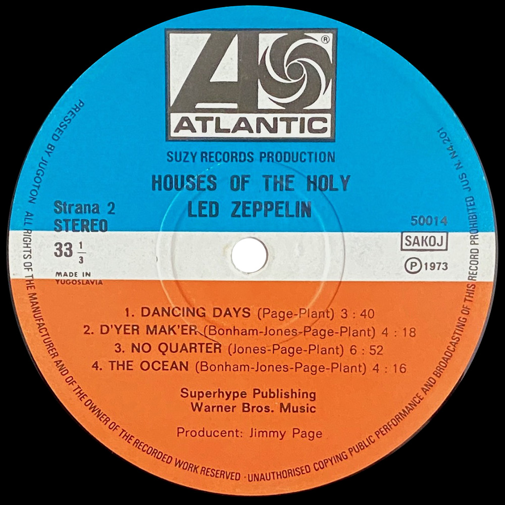 Version #2 – Has the band and album names in the upper blue section of the label and wider line spacing in the lower orange section