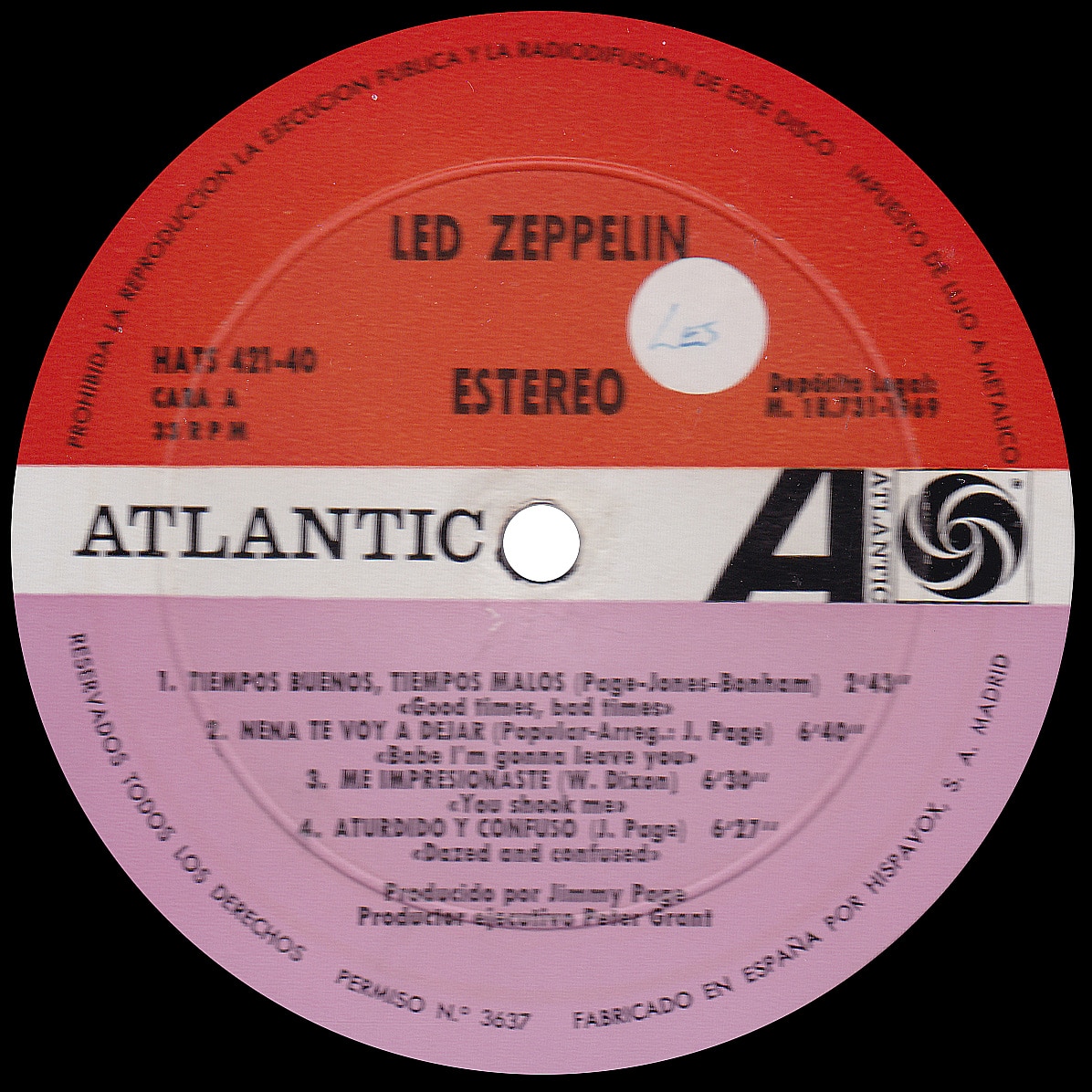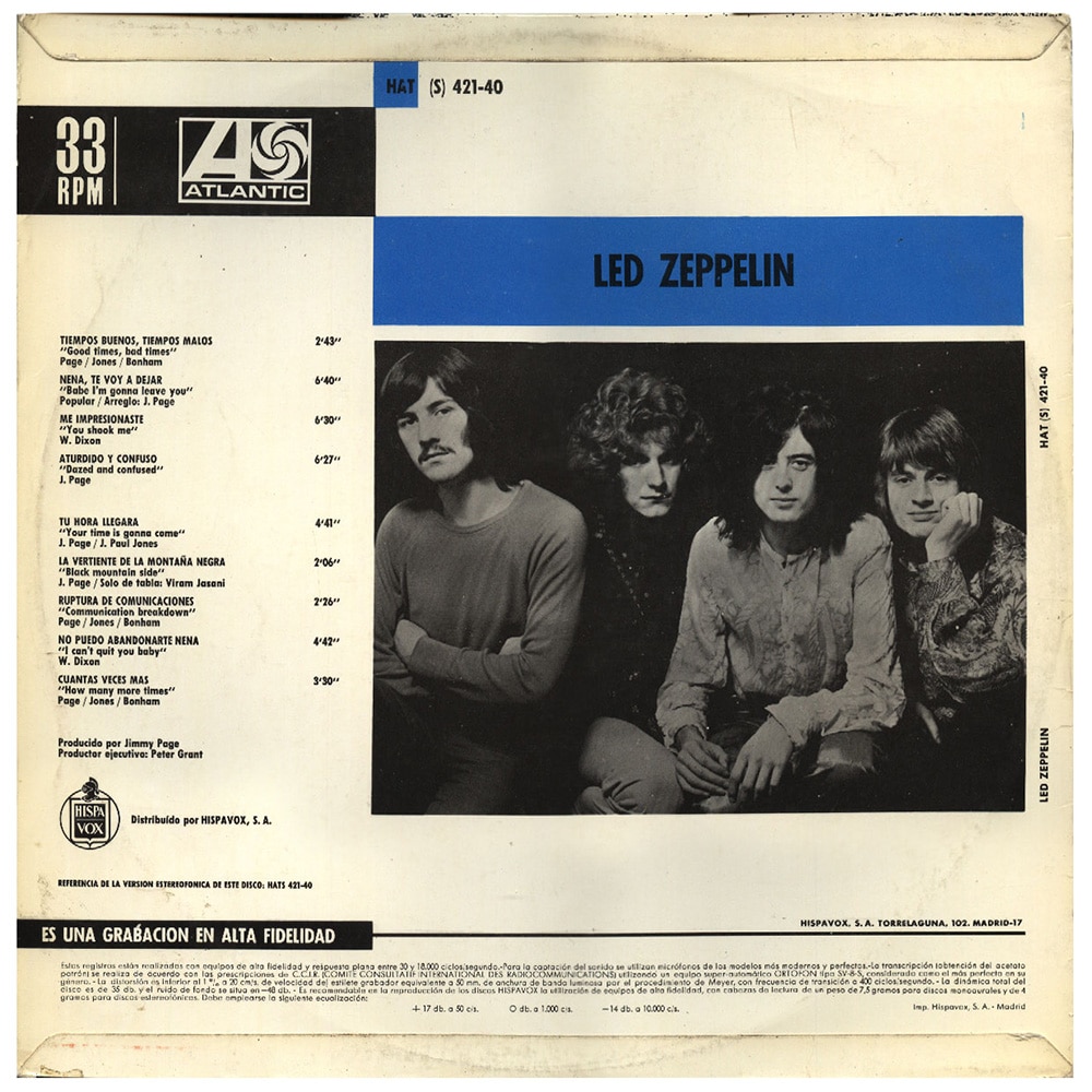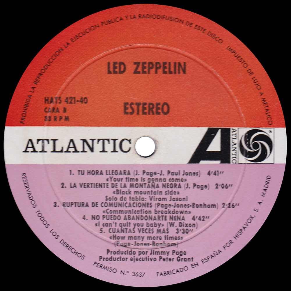 Version #1 – Front sleeve has no “estereo” bottom left, back sleeve with flipback edges top and bottom, back sleeve has a dark blue box for ‘Led Zeppelin’ and ‘HAT’ and a black box for ’33rpm’ and the Atlantic logo, “102” street number for Hispavox address on back sleeve, red/lilac labels, large copyright text around the edge of the red and lilac label sections with “Permiso N.o” (label design 1)