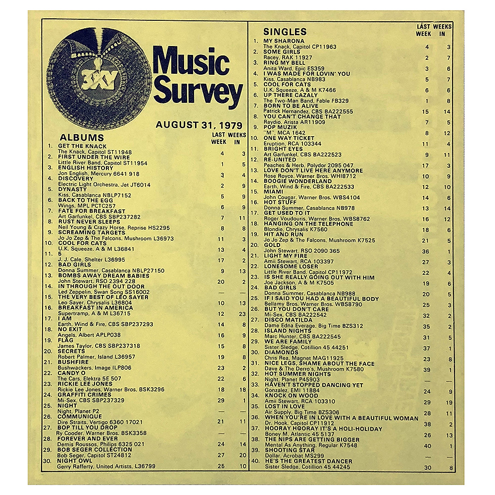 This Radio Survey from August 31, 1979, was distributed by 3XY in Melbourne, Australia.
