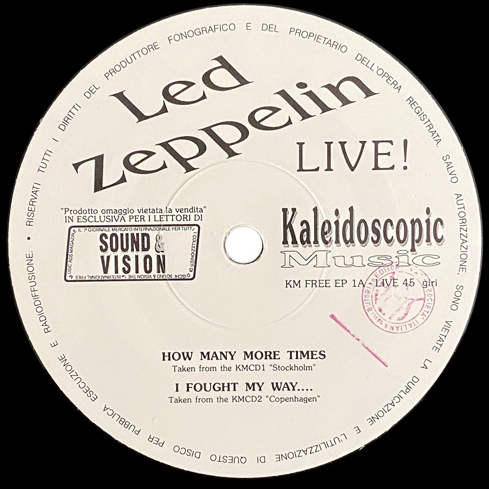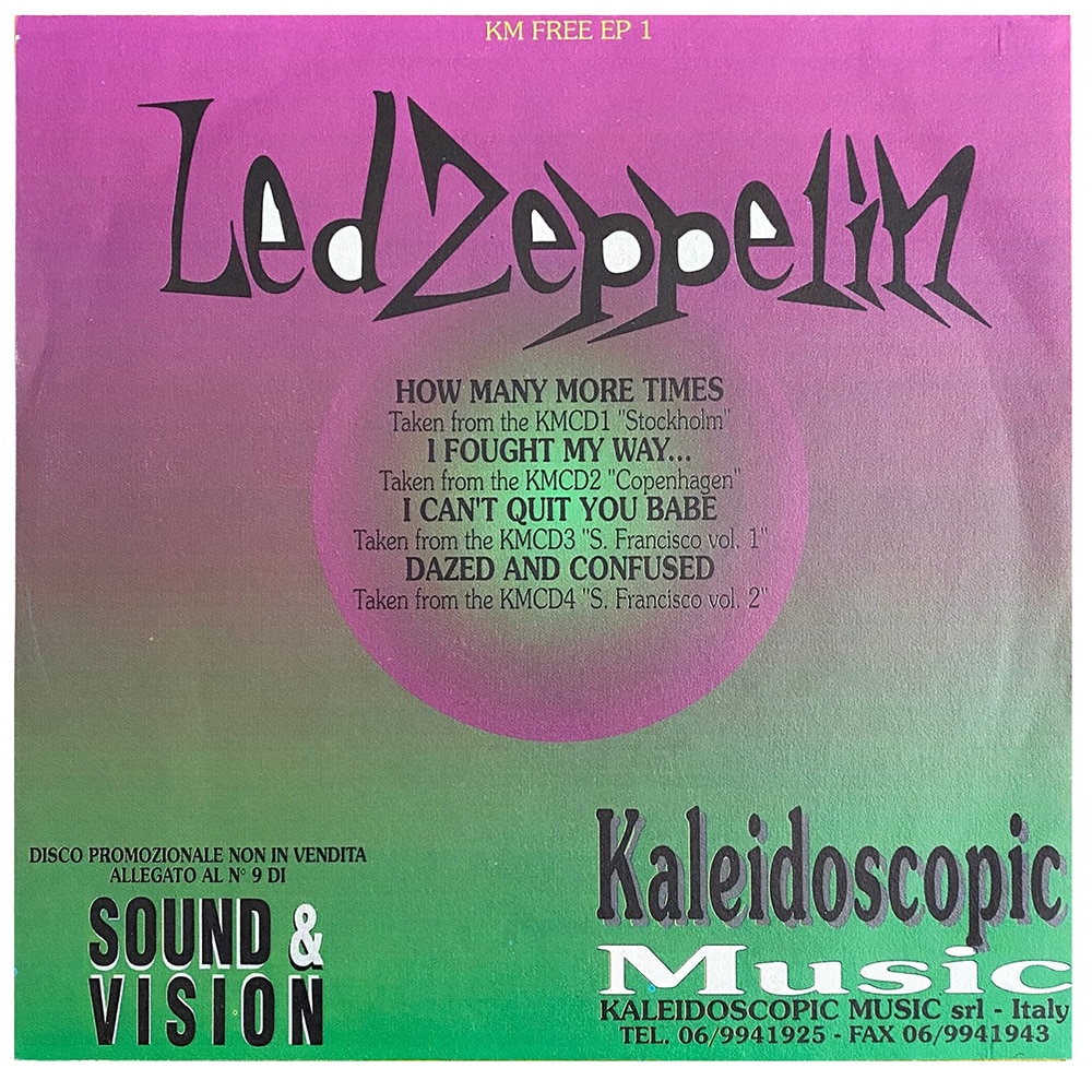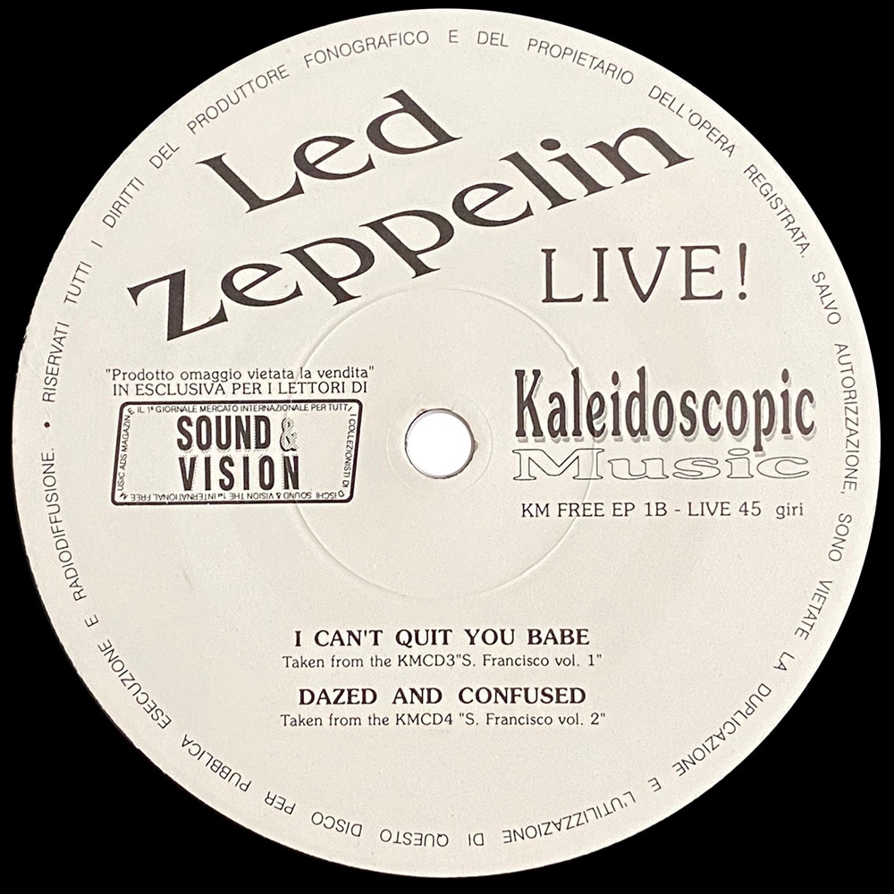 This free promotional EP was issued with Sound and Vision magazine in November 1989. The record carries the SIAE stamp on the labels, a common marker of Italian pressings, where copyright laws were often applied more loosely than in other European countries. The EP includes four 1969 live tracks: How Many More Times, I Fought My Way, I Can’t Quit You Baby, and Dazed and Confused. Bearing the catalog number KM Free EP 1, it was pressed by Kaleidoscopic Music to promote four of the label’s live CD releases.